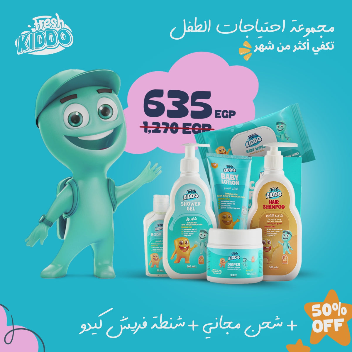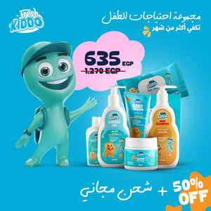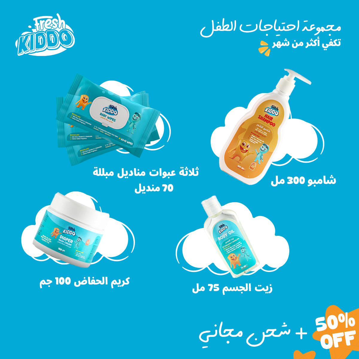 مجموعة فريش كيدو للعناية بطفلك هتكفيه لأكثر من شهر، روتين يومي متكامل يحمي طفلك ويضمن له نظافة وانتعاش دائم.